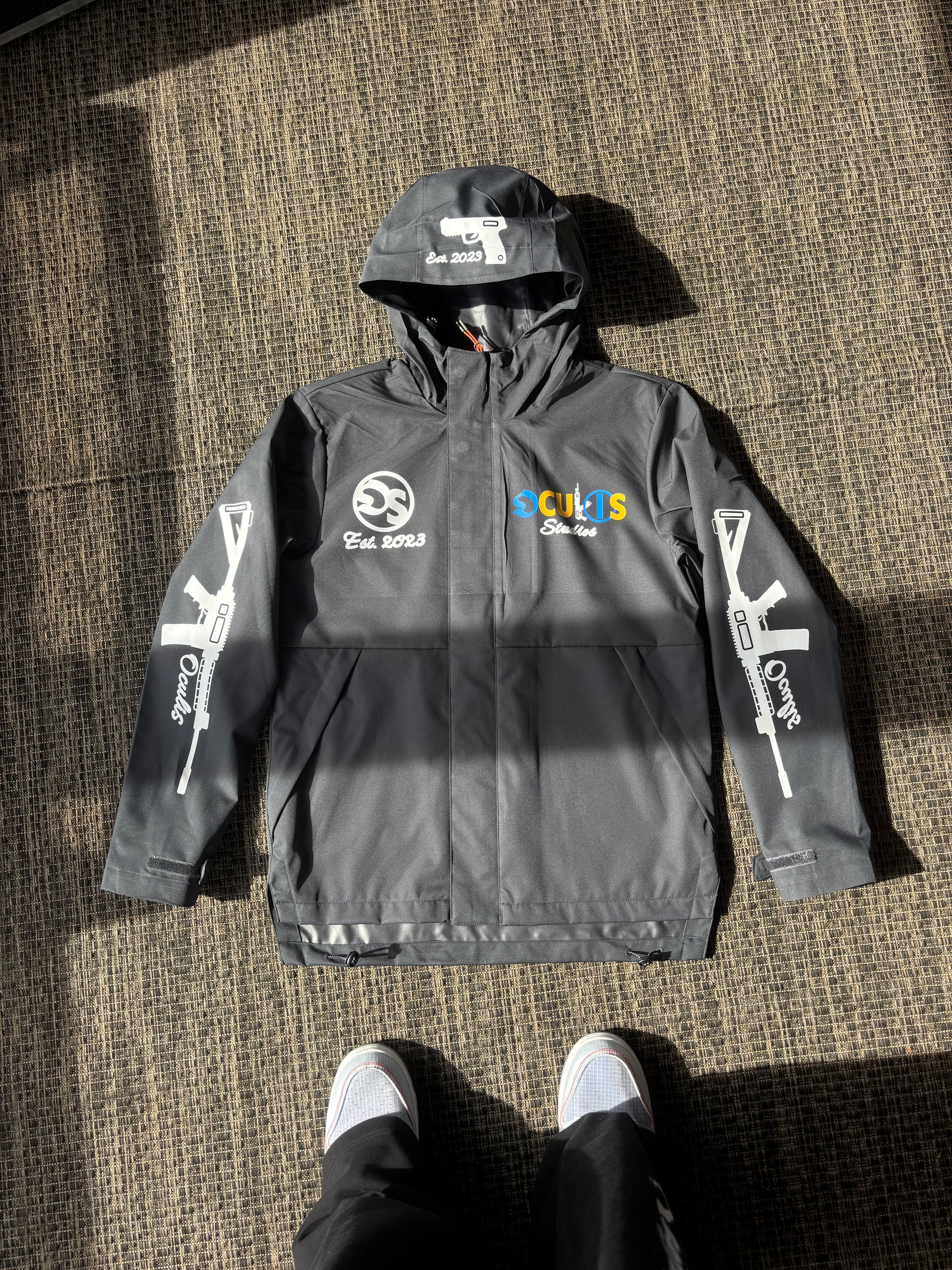 Lightweight rain jacket with print on sleeves, chest, back and hood